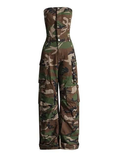Camouflage Cargo Jumpsuits For Women Starpless Sleeveless High Waist Spliced Pockets Streetwear Jumpsuit Female New
