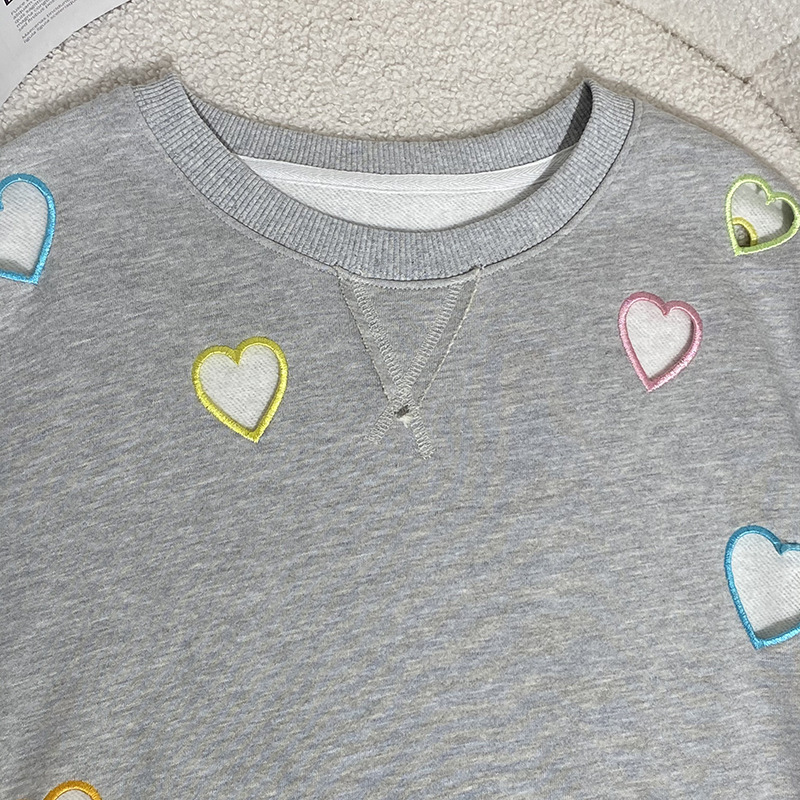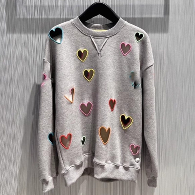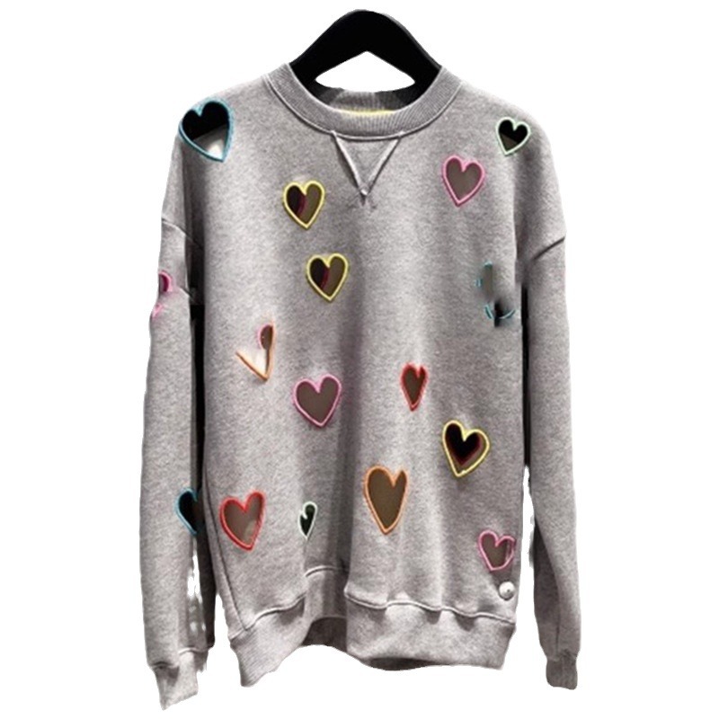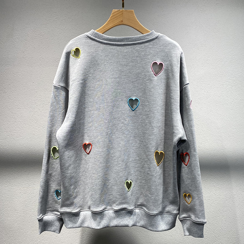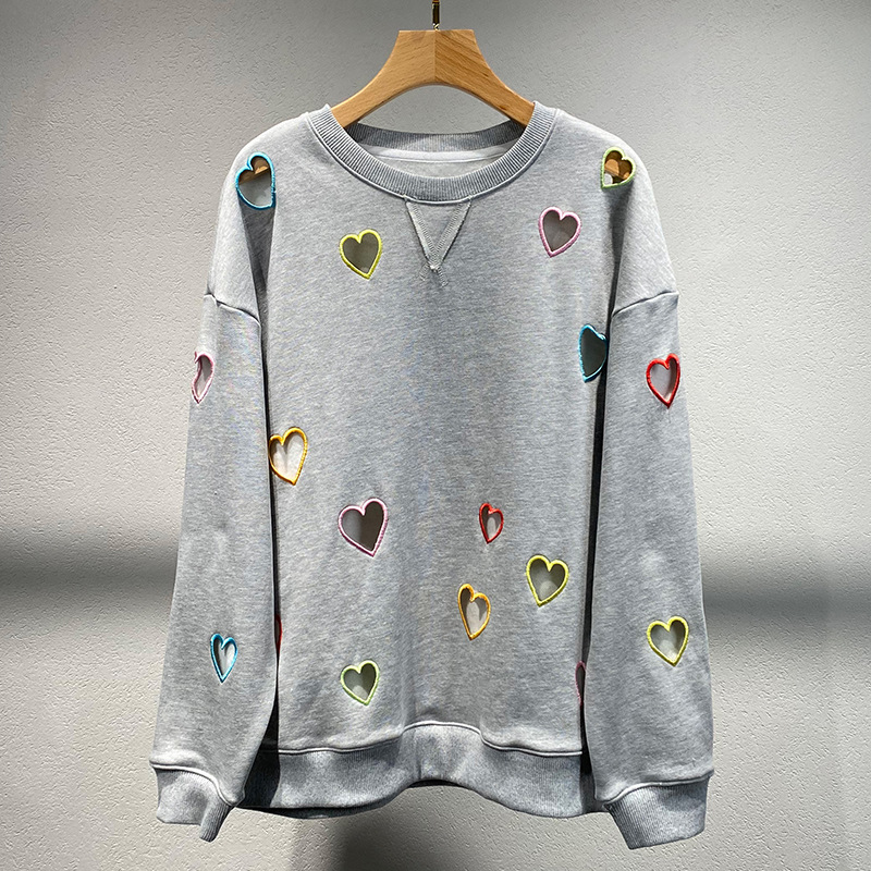 Small niche autumn and winter new grey round neck hollow out heart embroidered long sleeved hoodie for women